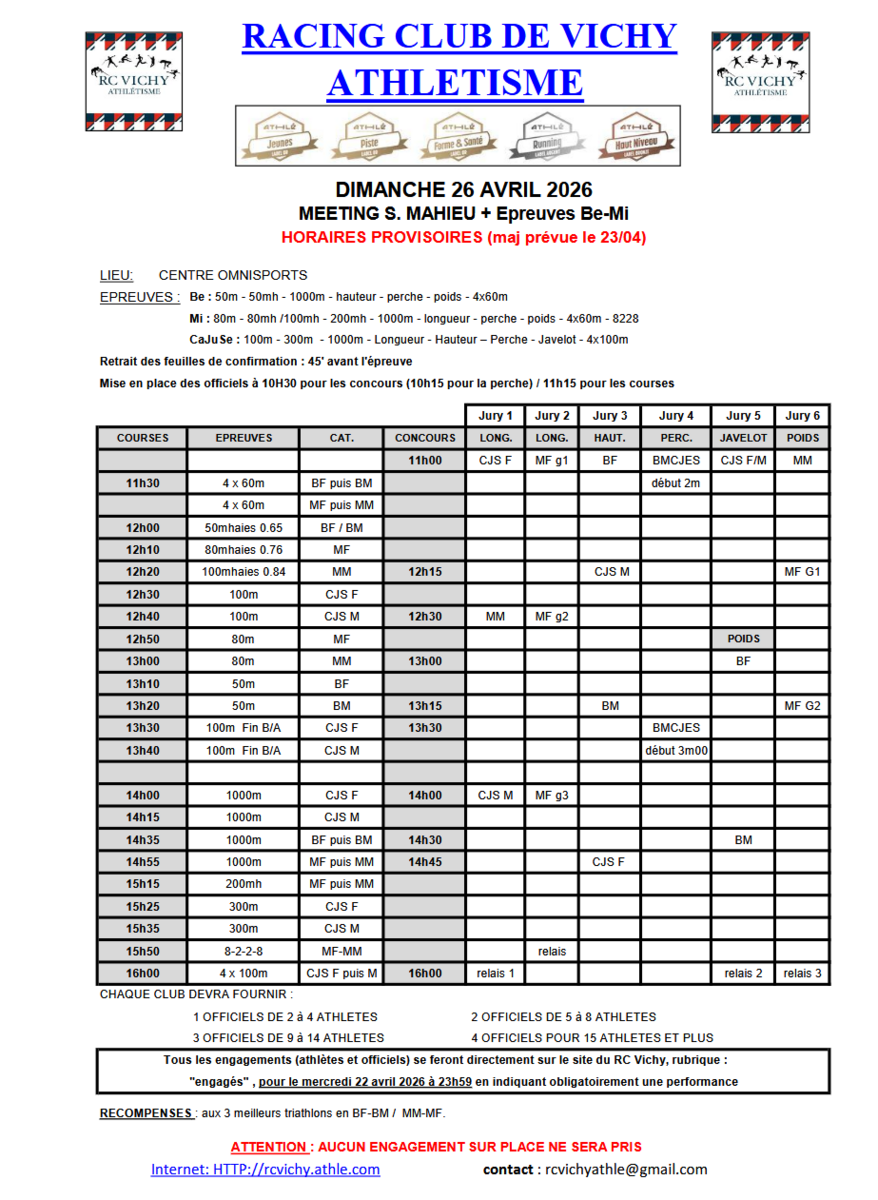 Meeting (cadets) et Triatlon Benjamins/Minimes Vichy (26/04/2026)
